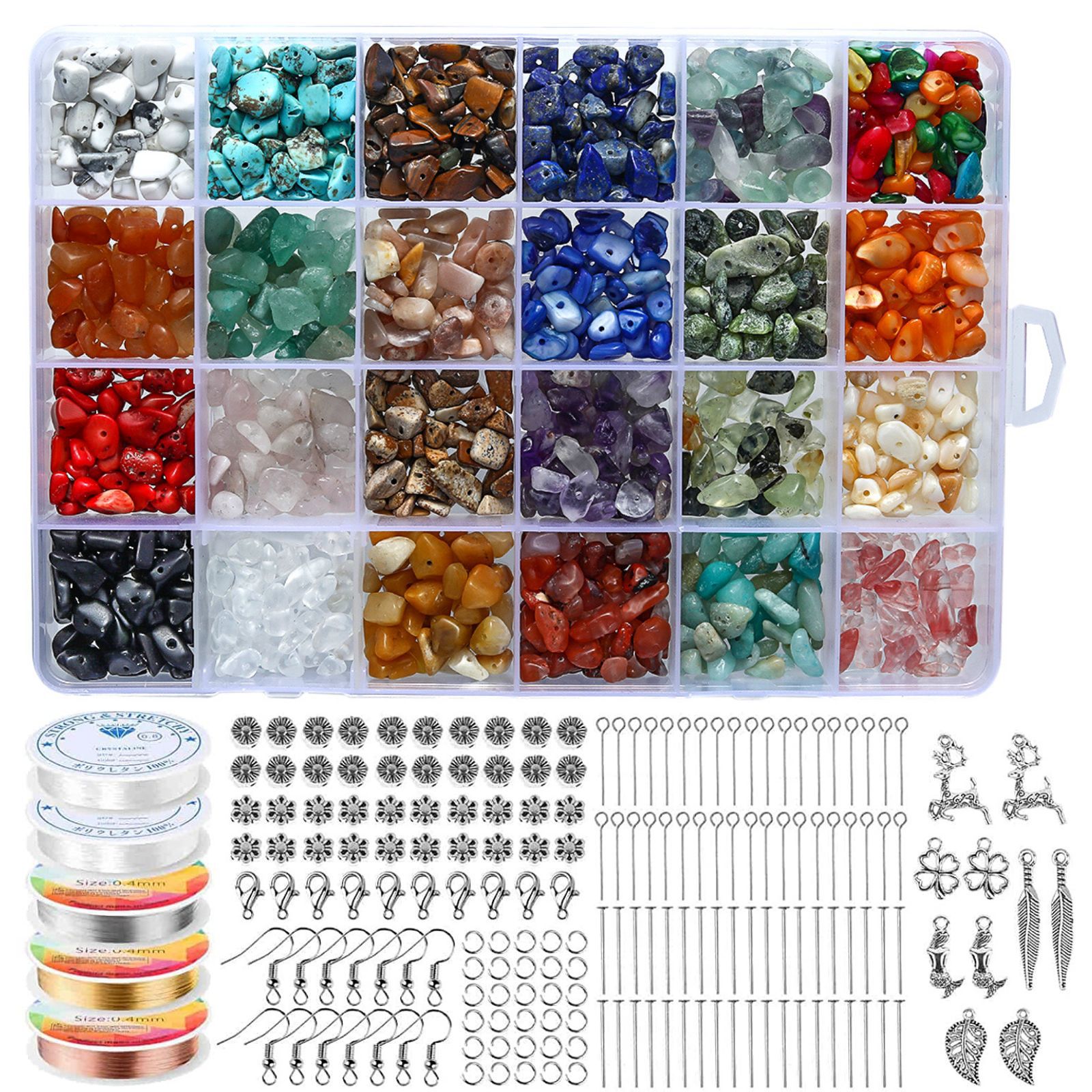 H: 24 styles gravel +130pcs silver pendants (5 pieces) +50pcs open rings +100pcs ear hooks +50pcsT needles + 50PCS 9 needles +2 rolls of elastic rope + scissors + pliers +1 roll of 1M steel wire ring
